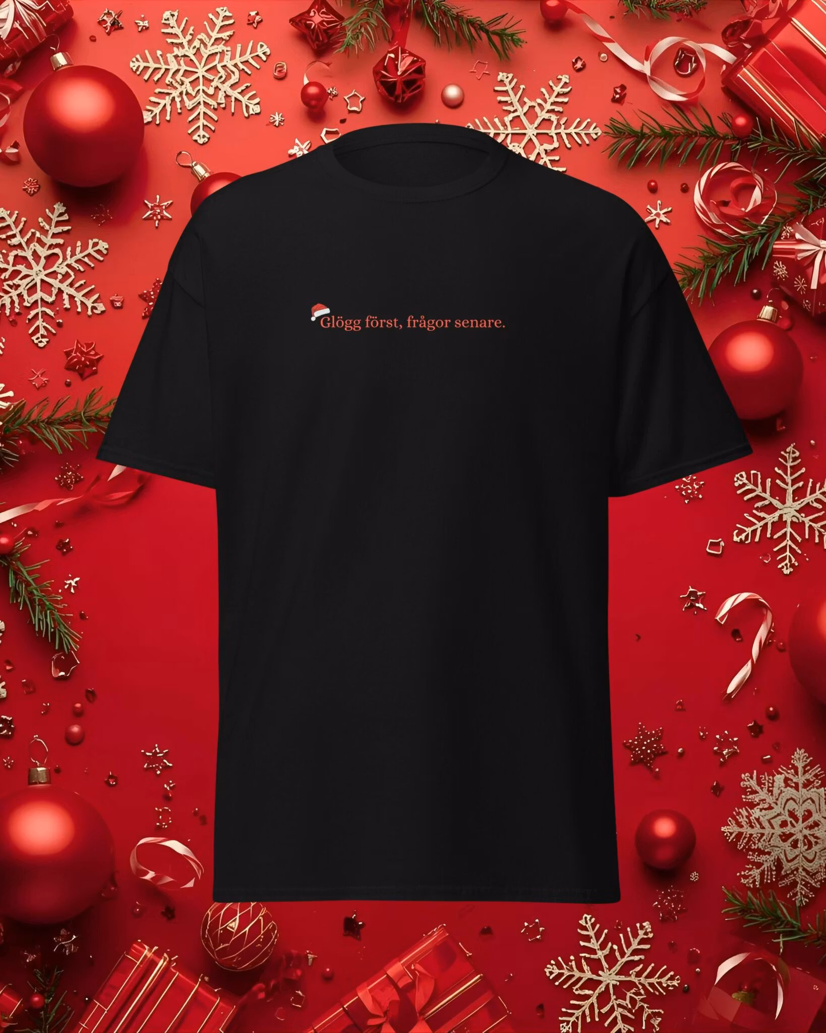 Den perfekta tröjan för alla som vet att glögg inte bara är en dryck – det är en livsstil. Med “Glögg först, frågor senare” gör du det glasklart att julens viktigaste ritual kommer före allt annat. Perfekt för julmys, adventsfika, glöggmingel eller kontorets fredagsfika när du redan mentalt checkat in på julledighet.