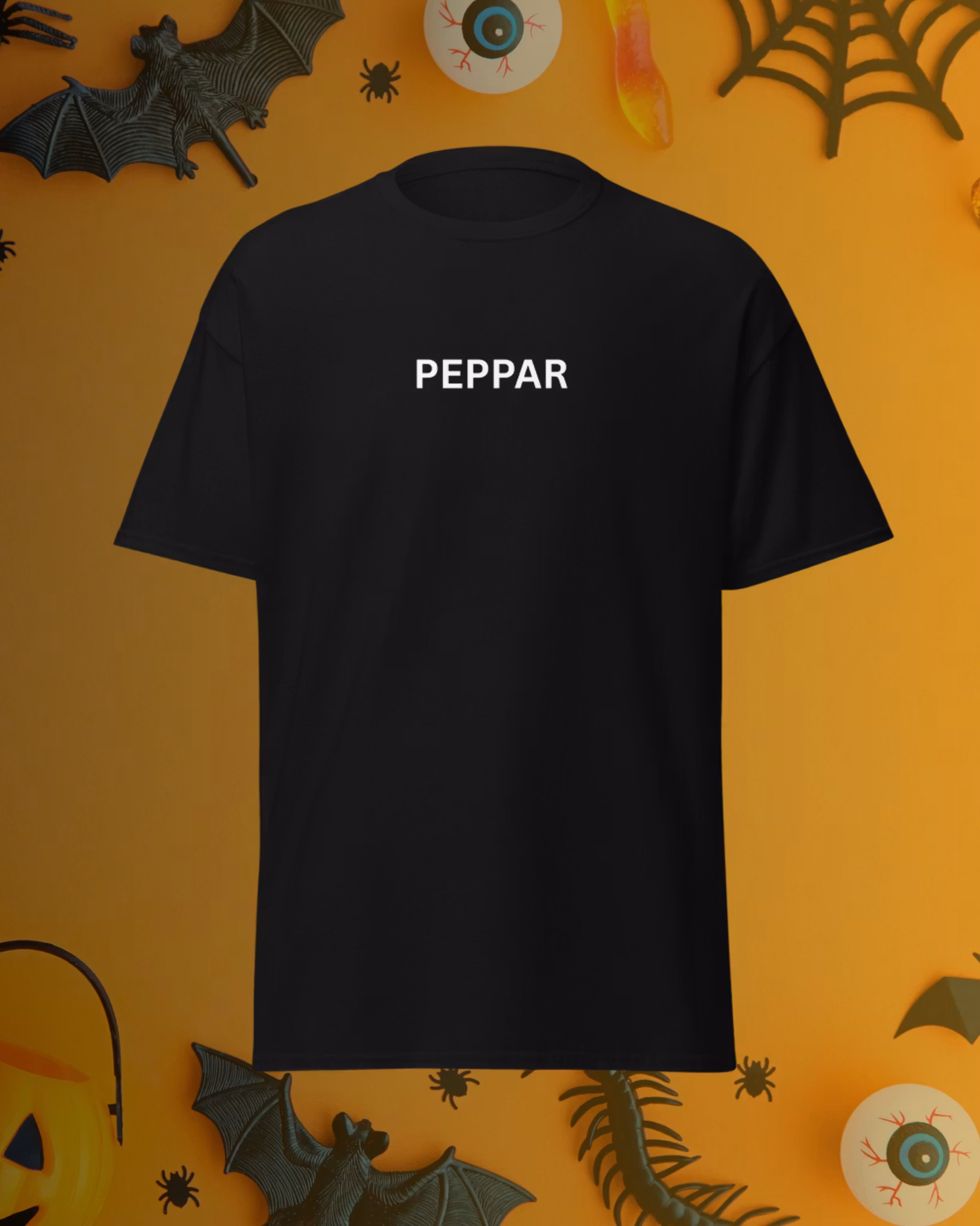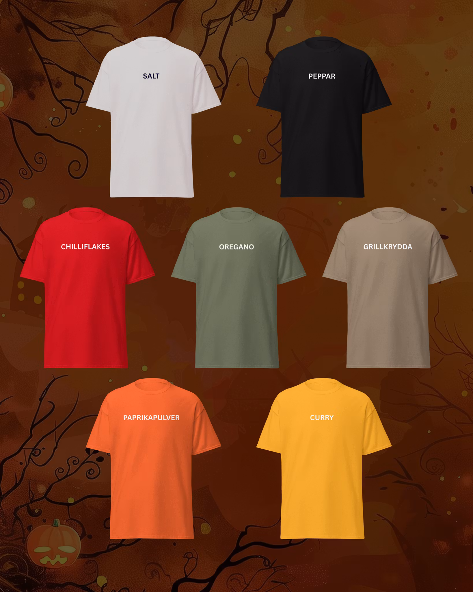 Alla vet att Halloweenutklädnader kan vara jobbiga, svettiga och lite för mycket. Därför finns vår krydd-t-shirt – tråkig, enkel och rakt på sak. Du behöver inte sminka dig i timmar eller bära obekväma dräkter, du bara drar på dig en tröja och är officiellt en del av ett helt kryddskåp. “Det är så basic att det nästan blir roligt.” Perfekt för dig (och ditt gäng) som vill delta i maskeraden med minsta möjliga ansträngning.