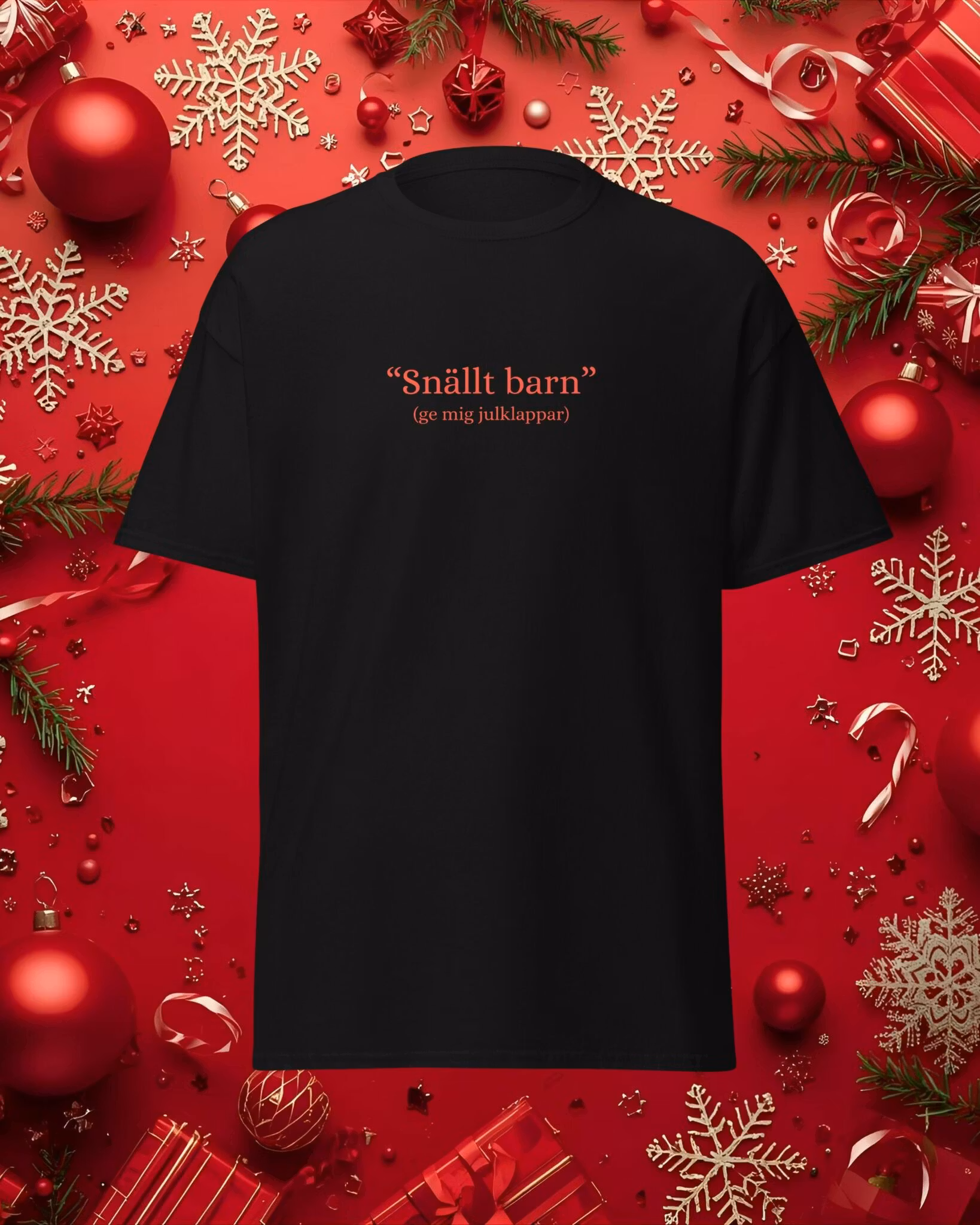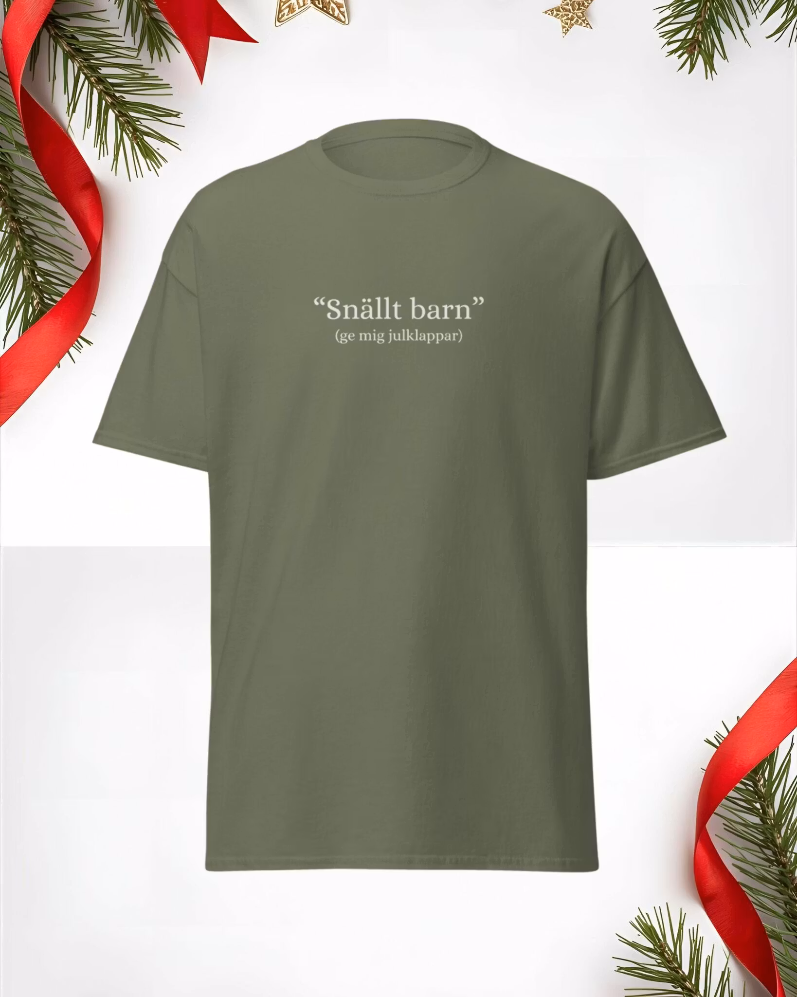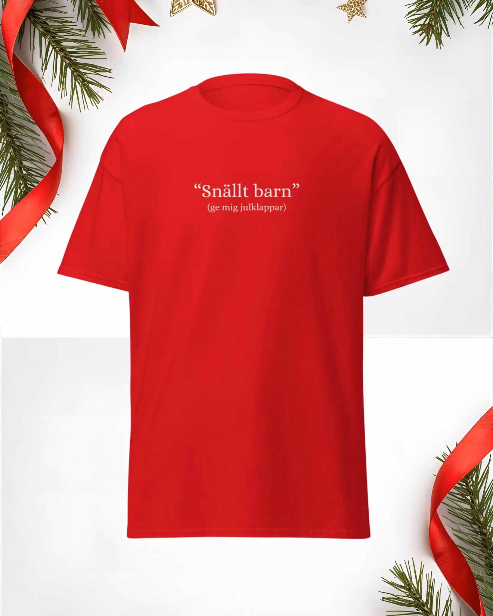 Oavsett om du faktiskt varit snäll eller bara känner att du förtjänar något extra i år, så är denna t-shirt det perfekta sättet att göra din önskan tydlig. Med texten “Snällt barn – ge mig julklappar” bjuder du på både humor och kravlös charm.