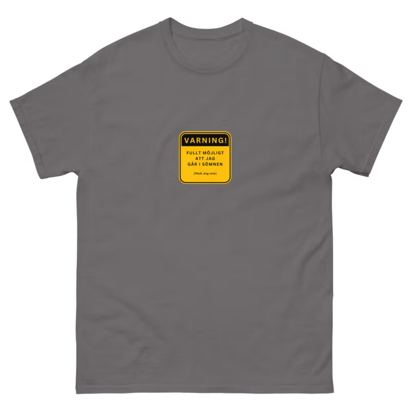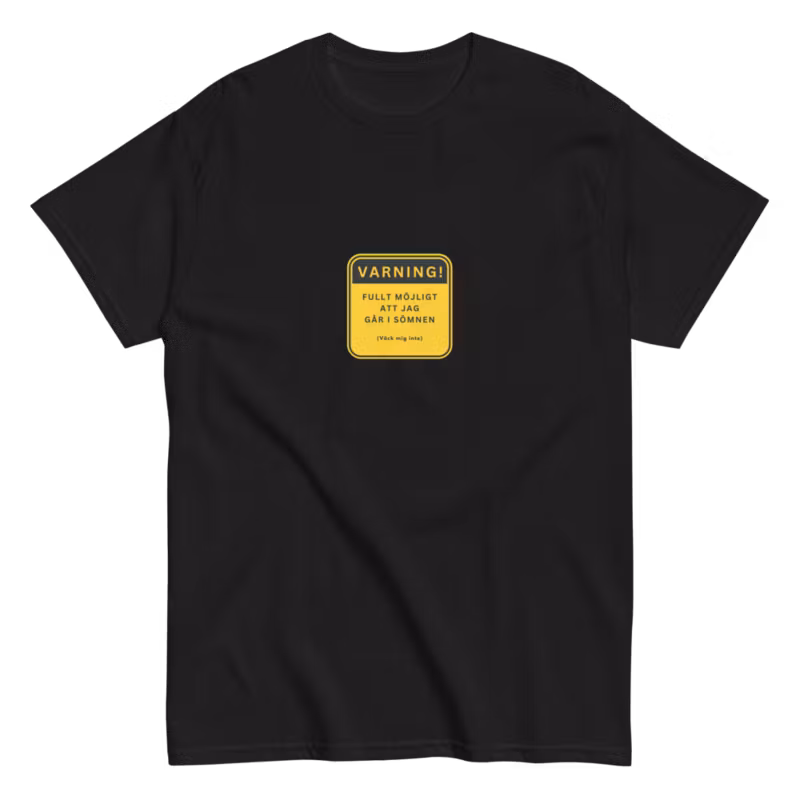 Känner du att du ibland är på autopilot? Då är vår Går i sömnen-t-shirt något för dig. Med sitt humoristiska tryck och bekväma passform blir den snabbt din nya favorit. Perfekt för en avslappnad dag hemma, en utekväll eller som en rolig present till någon som alltid verkar vara i sitt eget lilla universum.