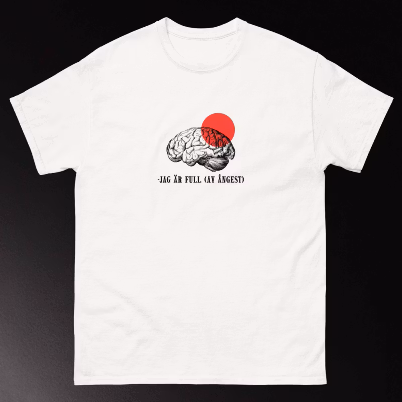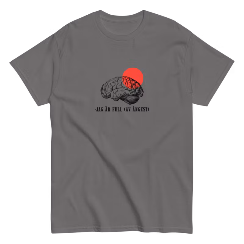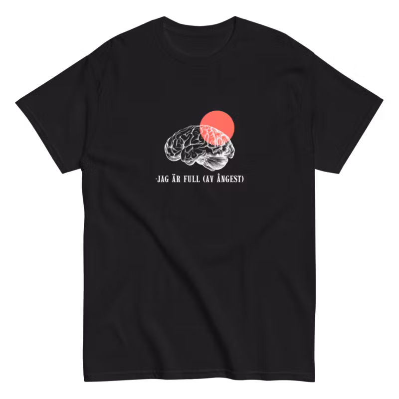 Känner du att ångest är en ständig följeslagare? Då är vår "Jag är full (av ångest)"-t-shirt något för dig. Med sitt humoristiska tryck och bekväma passform blir den snabbt din nya favorit. Perfekt för en avslappnad dag hemma, en utekväll eller som en rolig present till någon som alltid har en ursäkt för att inte göra något.