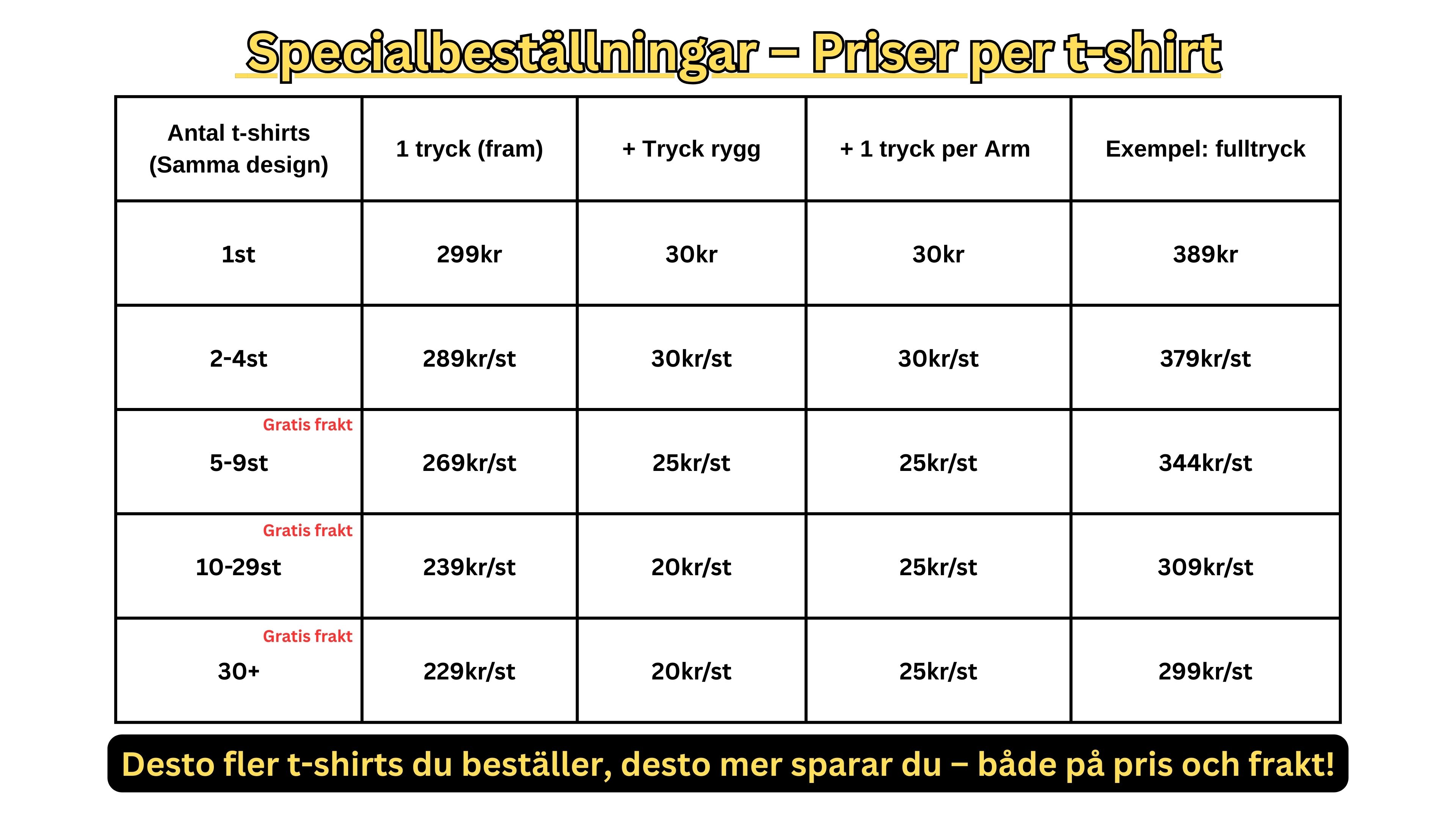 (prislistan är för T-shirts i unisex storlek S-XL, för andra storlekar kan priset skilja något)